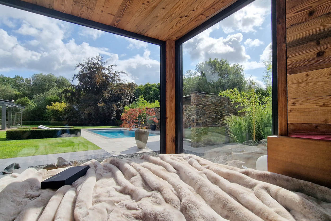Ein Wellnesstag im eigenen Garten? Das ist pure Entspannung… einfach traumhaft! Vor allem, wenn es eine durchdachte Gartensauna nach Maß ist: von der Sauna über die Dusche bis hin zum Daybed ist alles unter einem Dach untergebracht und somit ein vollwertiger Outdoor Wellnessbereich. Große Glaselemente sorgen für einen phantastischen Ausblick ins Grüne. Am Abend ist die beleuchtete Gartensauna vom Haus aus ein echter Hingucker. Entspannung pur! Perfekt, um vom Alltag abzuschalten und die Seele baumeln zu lassen…