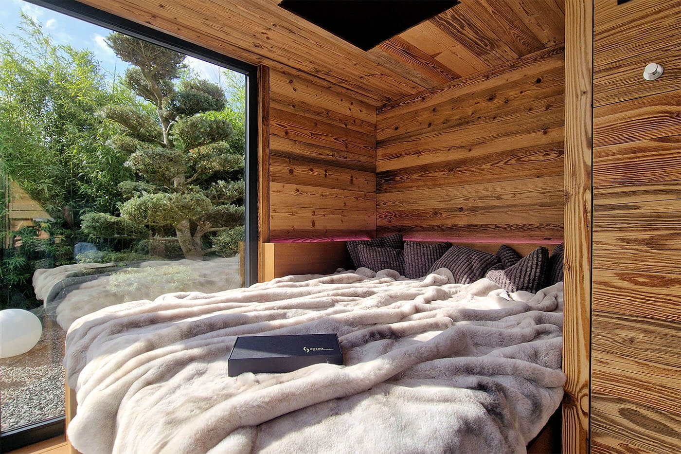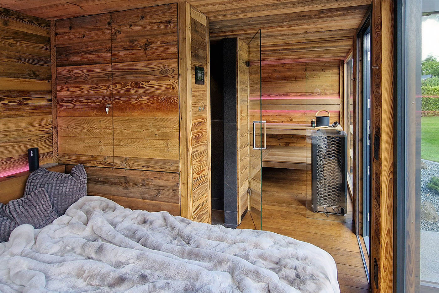 Für eine angenehme Temperatur, auch in der kälteren Jahreszeit, sorgen die Fußbodenheizung und ein Infrarotstrahler. Mit dem großen Daybed und der integrierten Dusche lässt sich das Saunahaus auf Wunsch auch als Gästehaus nutzen.