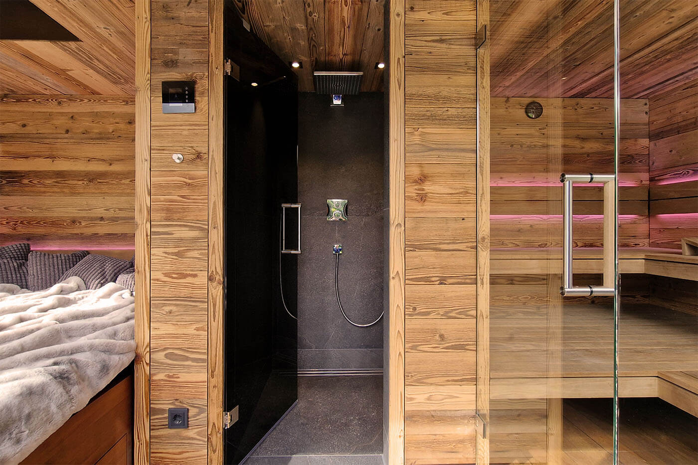 Last but not least lässt es sich auf dem kuscheligen Daybed herrlich entspannen. Praktisch ist die integrierte Schublade, wo Saunahandtücher & Aufgüsse griffbereit verstaut sind. Um die Saunapausen mit entspannender Musik zu untermalen, wurde ein Sonos Soundsystem mit Induktions-Ladestation am Kopfende des Daybeds eingeplant.